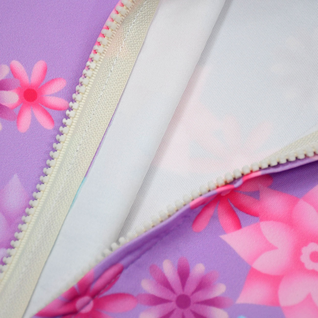 Casaco com zíper na frente, capuz nas costas e bolsos laterais. Cores vivas e com tema de Encanto da famíia Madrigal.