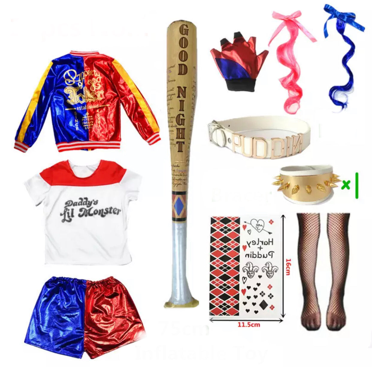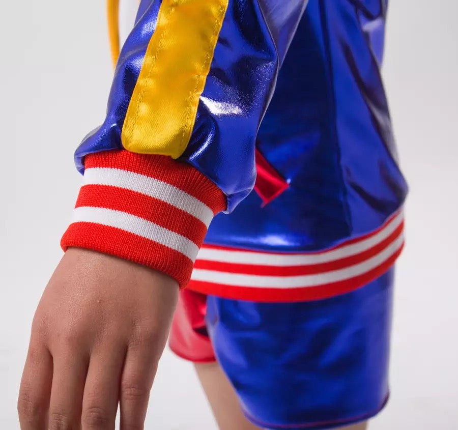 Produto contém jaqueta, blusa, shorts, meia, luvas, fitas de cabelo, bracelete, choker, adesivos e bastão inflável.