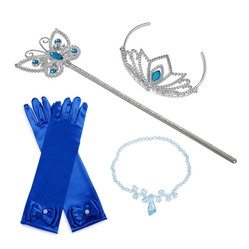 Produto contém vestido, luvas, colar, varinha, coroa e aplicações de borboletas.