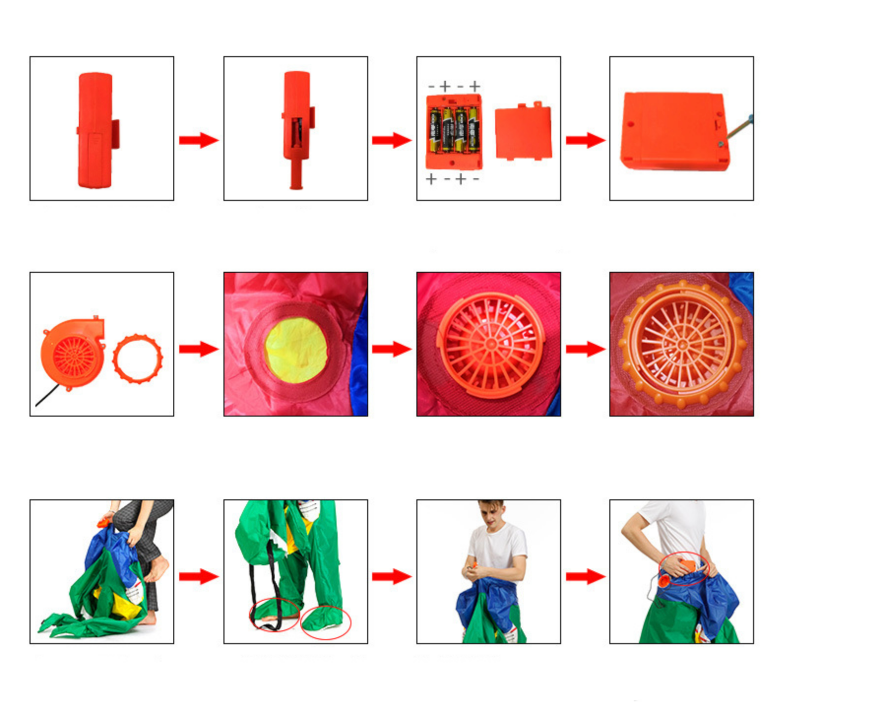 Fantasia divertida de alienígena. Feita com material de poliéster, possui internamente um singelo aparelho ventilador que proporciona a característica inflável da peça. Muito confortável e frequinho.
