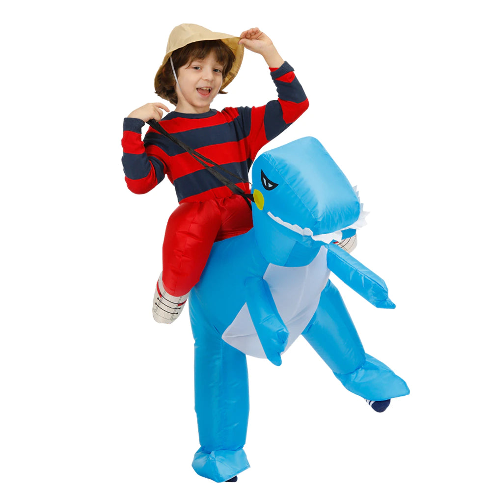 Fantasia divertida de dinossauro. Feita com material de poliéster, possui internamente um singelo aparelho ventilador que proporciona a característica inflável da peça. Muito confortável e frequinho.