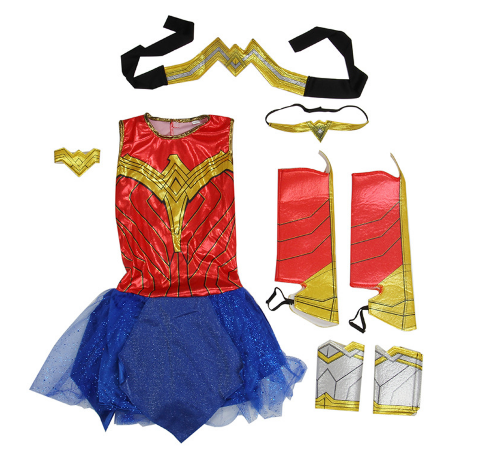 Produto acompanha: Vestido, Tiara, Cinto, Braceletes, Par de punhos de pulso e Par de caneleiras