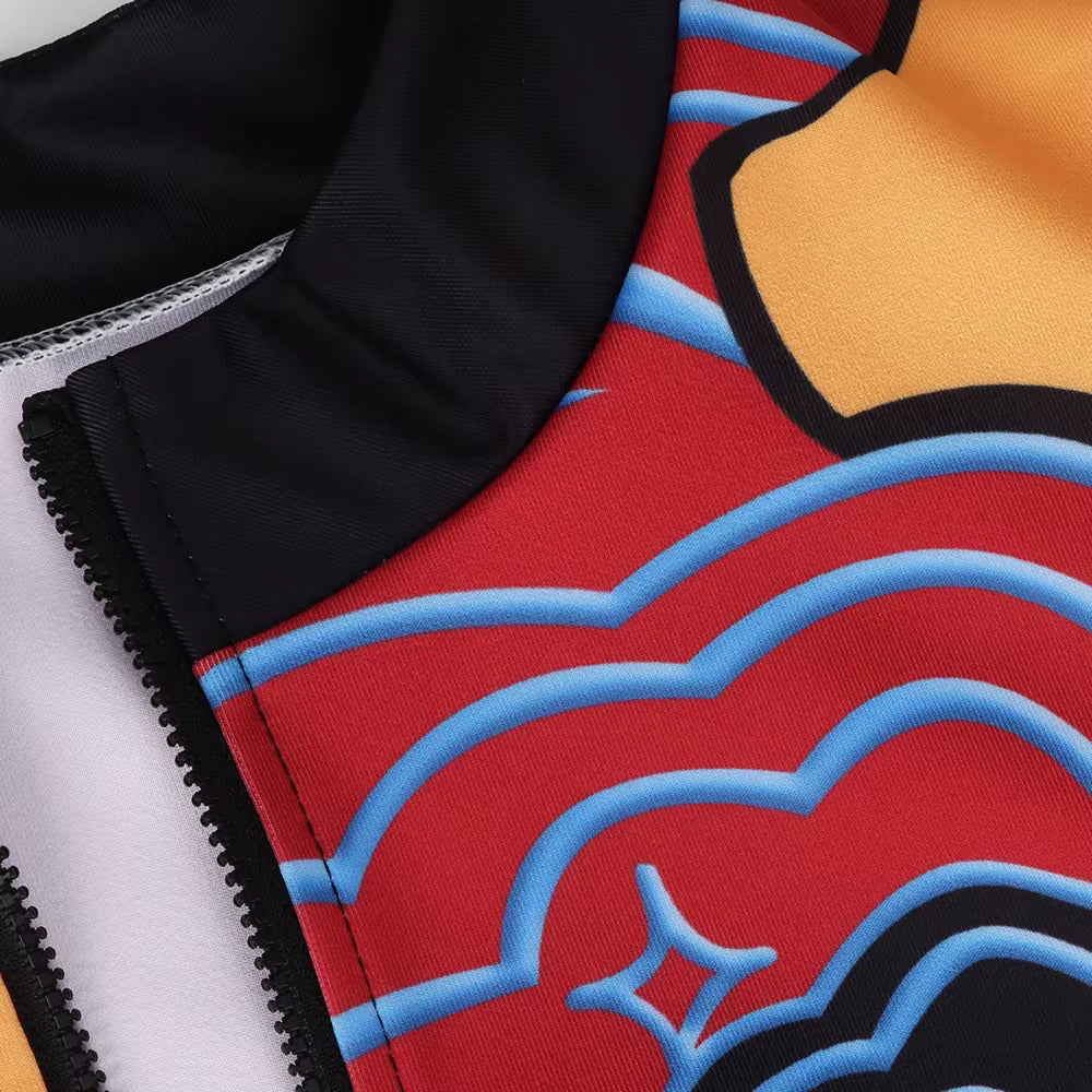 • Jaqueta moderna em poliéster com estampa digital vibrante e zíper frontal funcional, trazendo toda a autenticidade do figurino original.