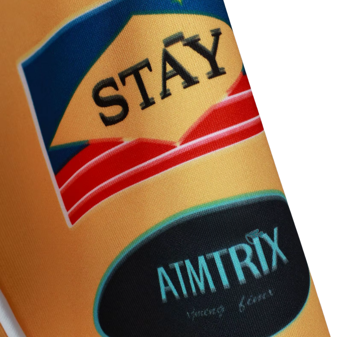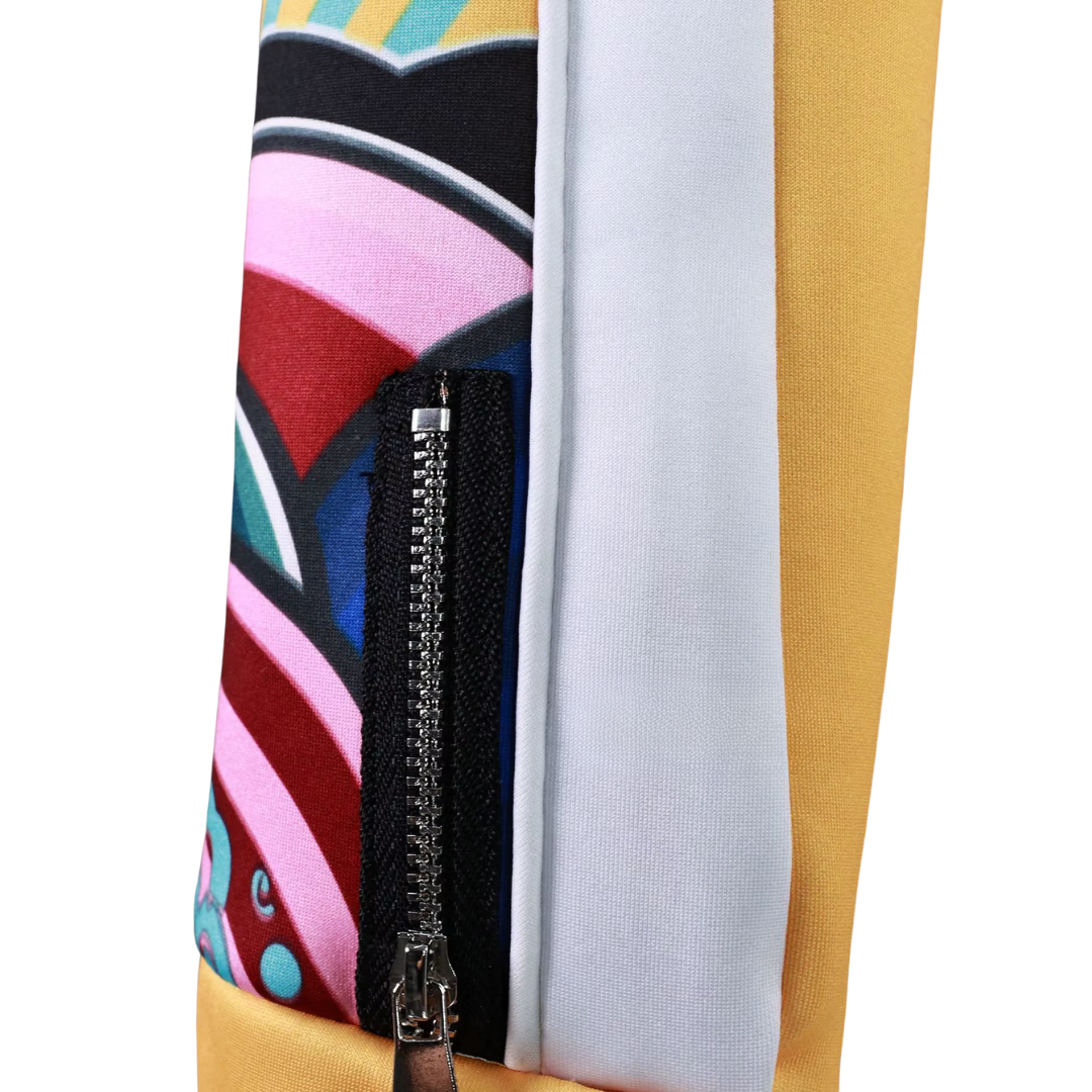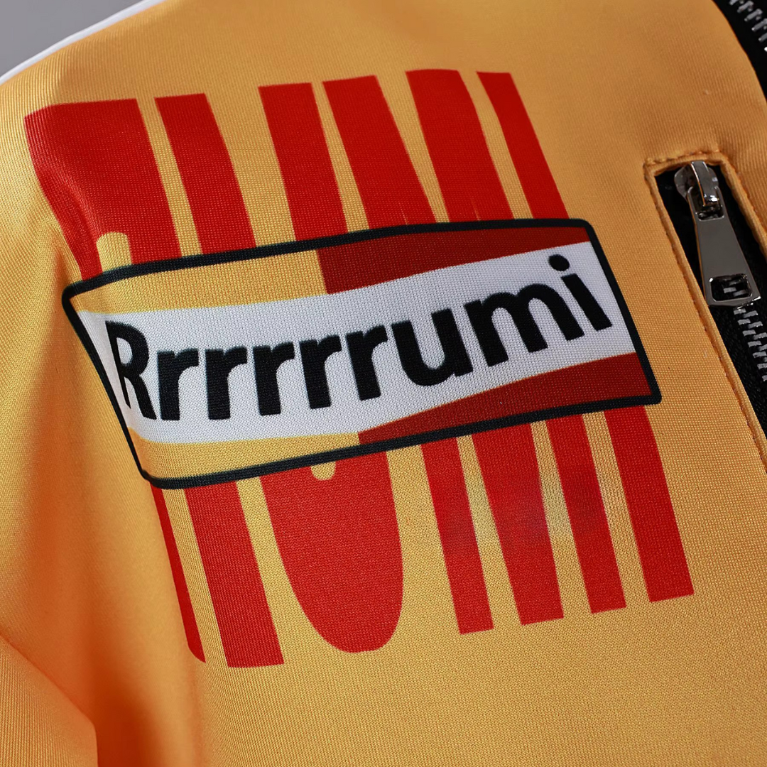 Jaqueta curta em amarelo vibrante, com detalhes gráficos e patches coloridos que remetem ao estilo futurista e às artes visuais do K-Pop.
