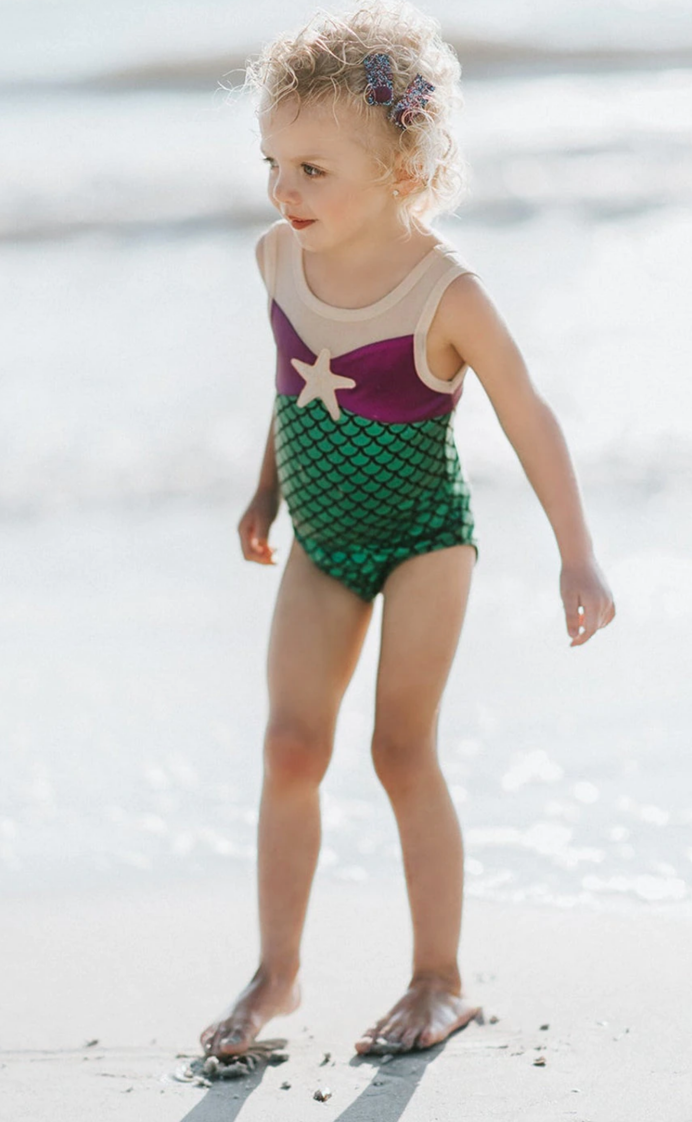 Torne o dia de praia ou piscina da sua filha mais divertido e especial com o nosso conjunto temático da sereia mais famosa!