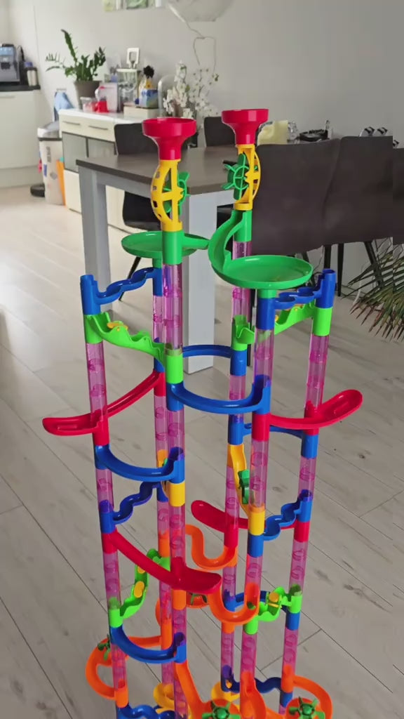 Feita com peças coloridas de encaixe, a criança pode montar infinitas combinações. Cada vez nasce uma pista nova — e cada descida da bolinha é uma aventura diferente!