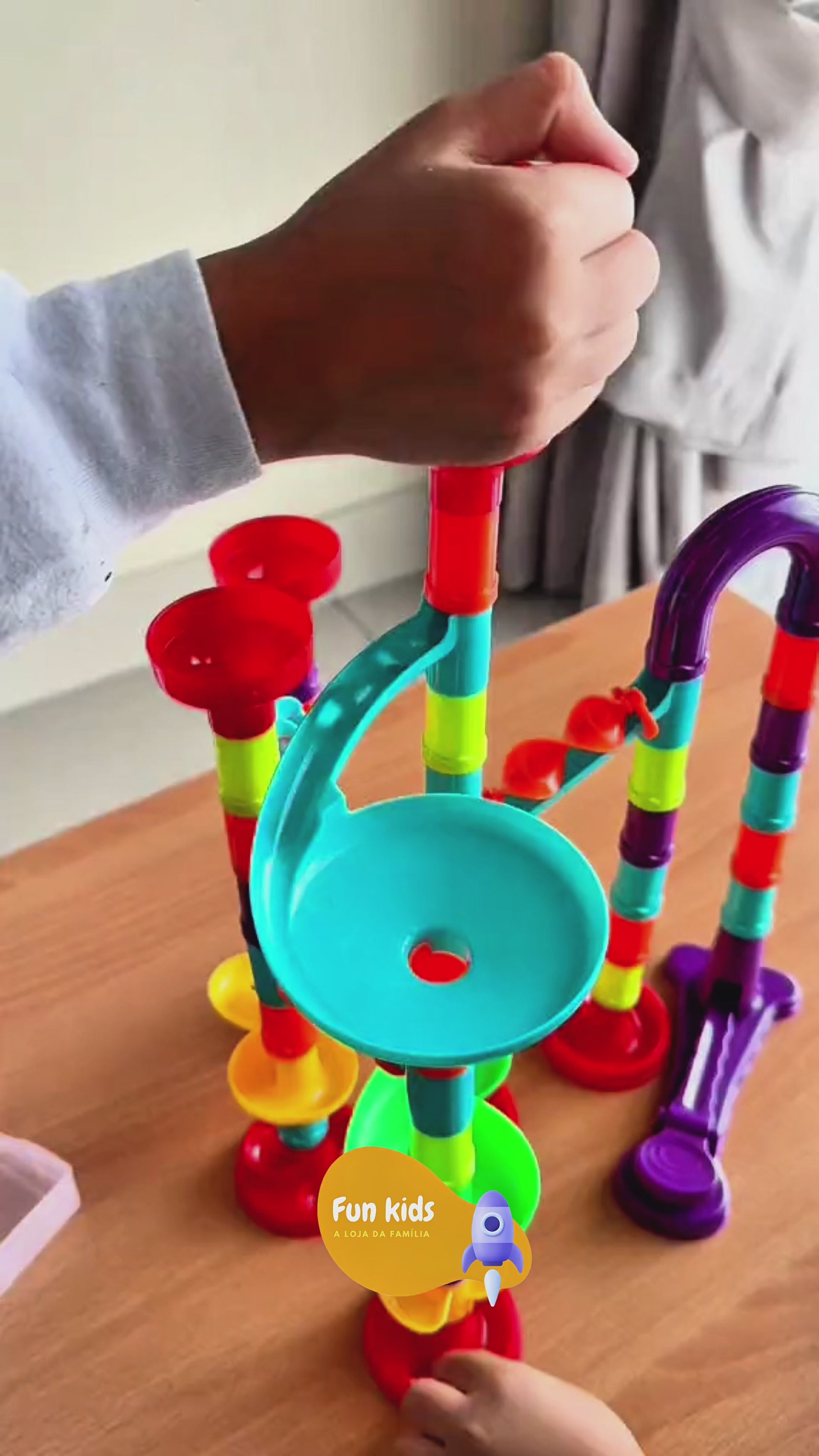 Feita com peças coloridas de encaixe, a criança pode montar infinitas combinações. Cada vez nasce uma pista nova — e cada descida da bolinha é uma aventura diferente!