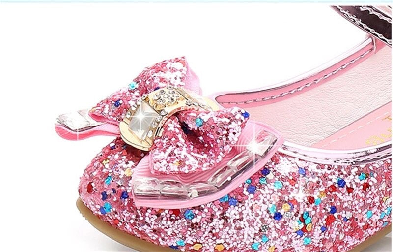 Princesa borboleta sapatos de couro crianças diamante bowknot salto alto crianças menina dança glitter sapatos moda meninas festa sapato de dança