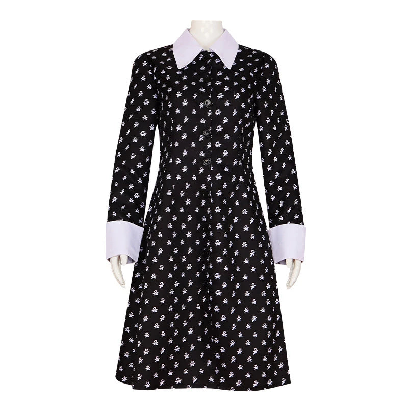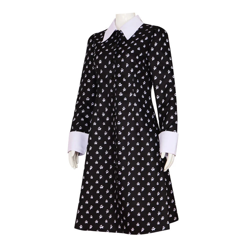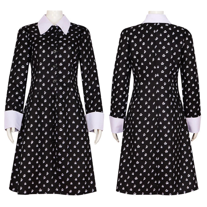 Traje cosplay de quarta-feira para crianças de Halloween, roupa de vestido de cosplay de mulher e menina Addams, roupas vintage pretas góticas estampadas vandinha