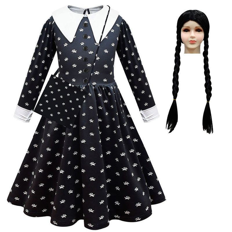 Traje cosplay de quarta-feira para crianças de Halloween, roupa de vestido de cosplay de mulher e menina Addams, roupas vintage pretas góticas estampadas vandinha